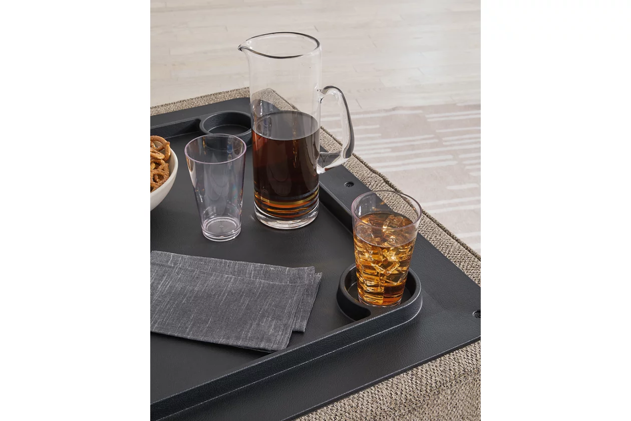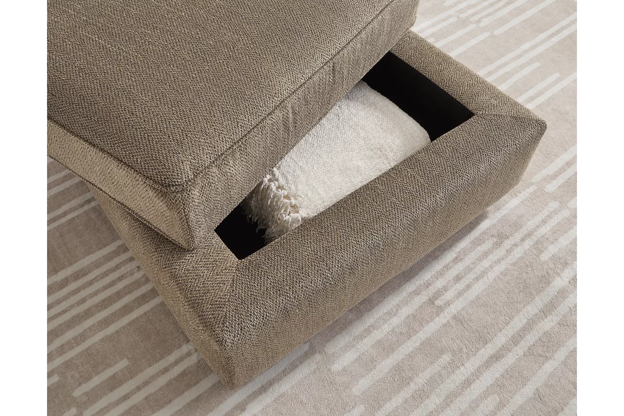 The luxe herringbone chenille upholstery is indulgently plush to the touch. A removable top conceals additional storage space and cup holders. With its clean-lined construction, this ottoman seamlessly pairs with contemporary aesthetics.
